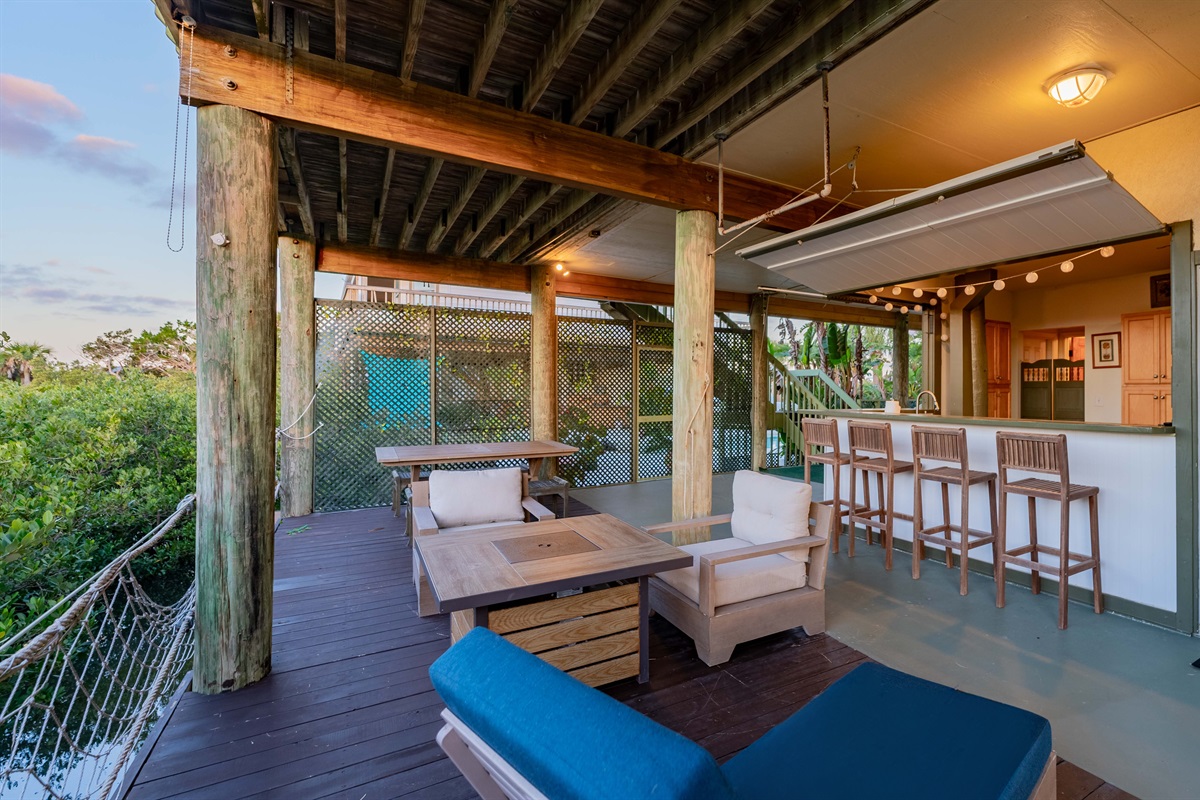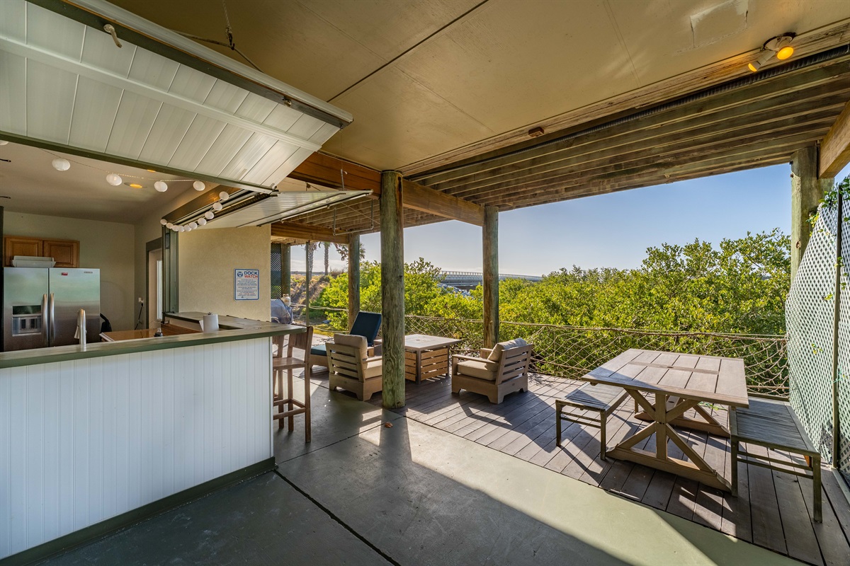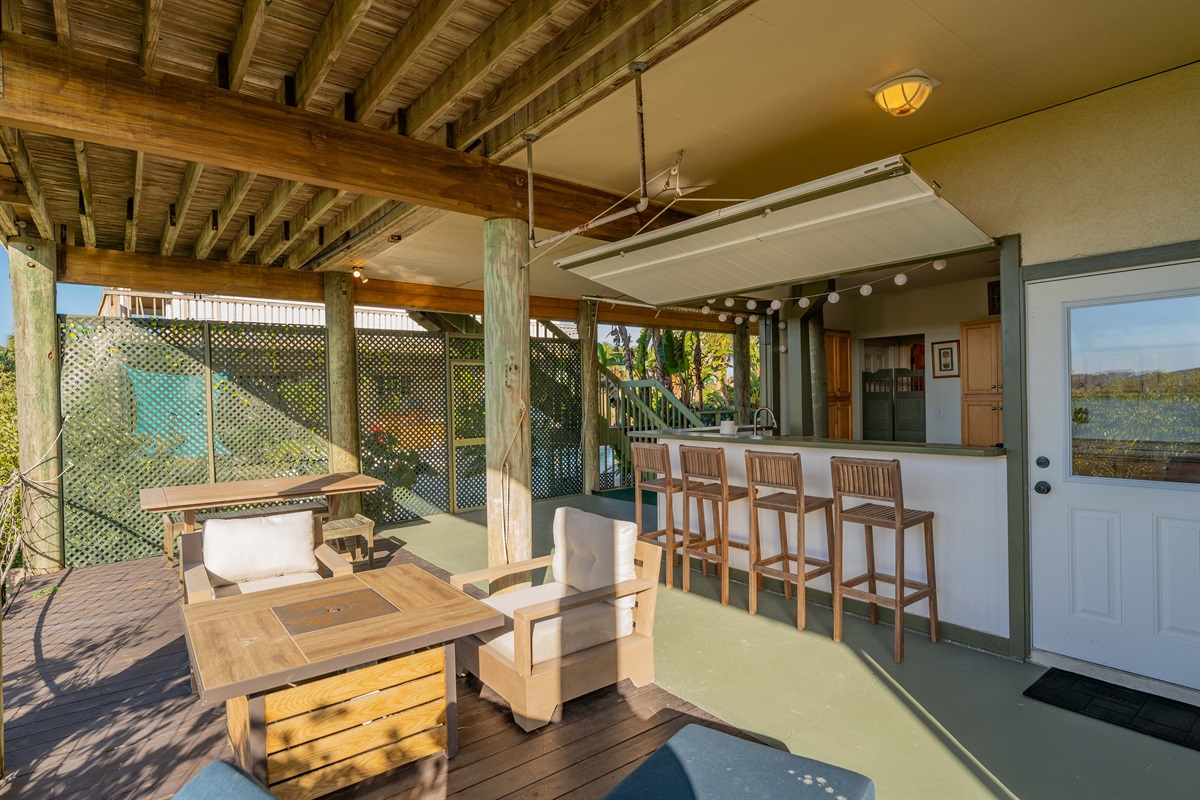• Outdoor summer kitchen: TV, stove, fridge, sink, prep space