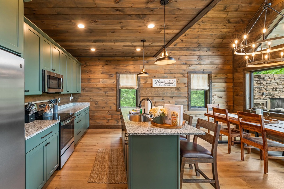 🔵 Fully equipped kitchen with dining for 8 + island seating for 4