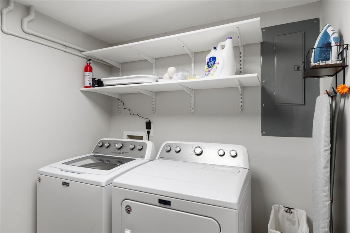• Guest bedroom + full bath + laundry room with family gear (pack ’n play, booster, gate, wagon)