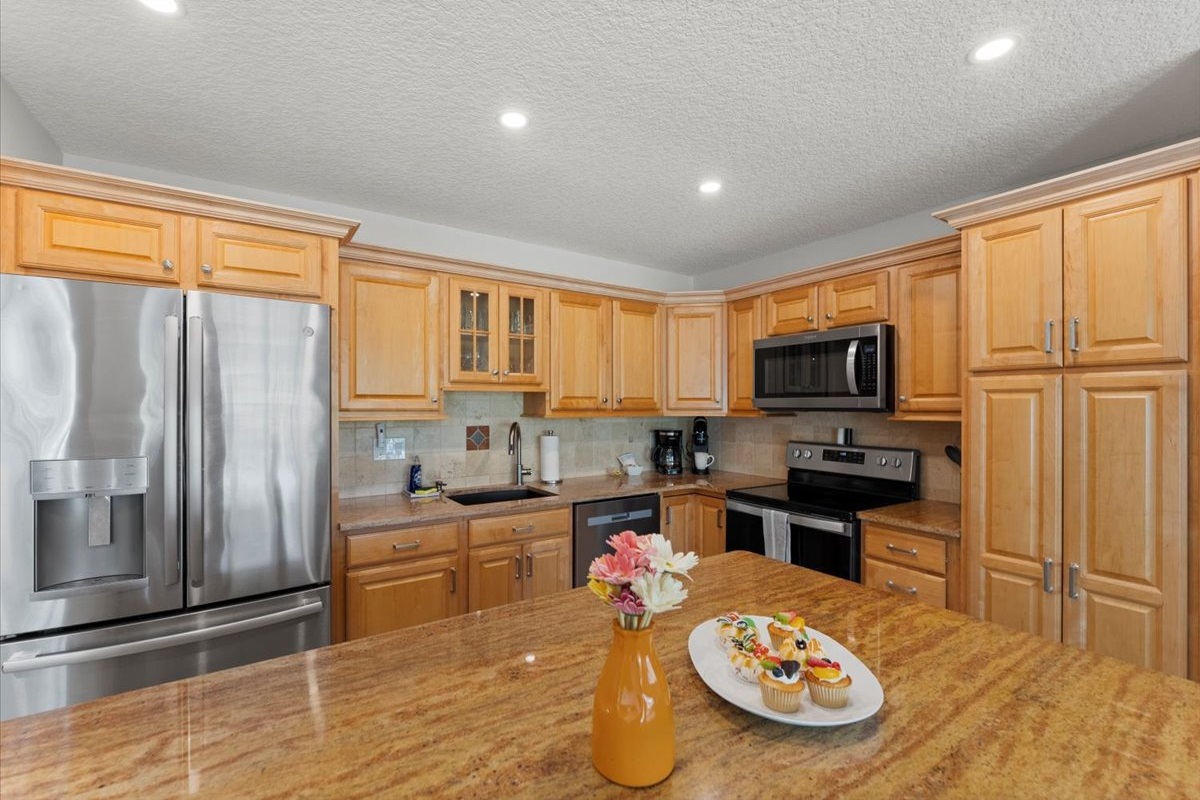 Open kitchen with stainless appliances, coffee maker & bar seating