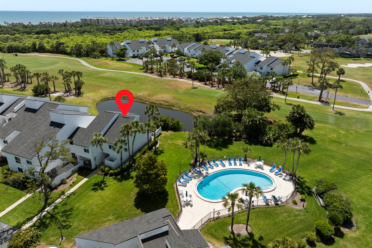 Community heated pool steps away