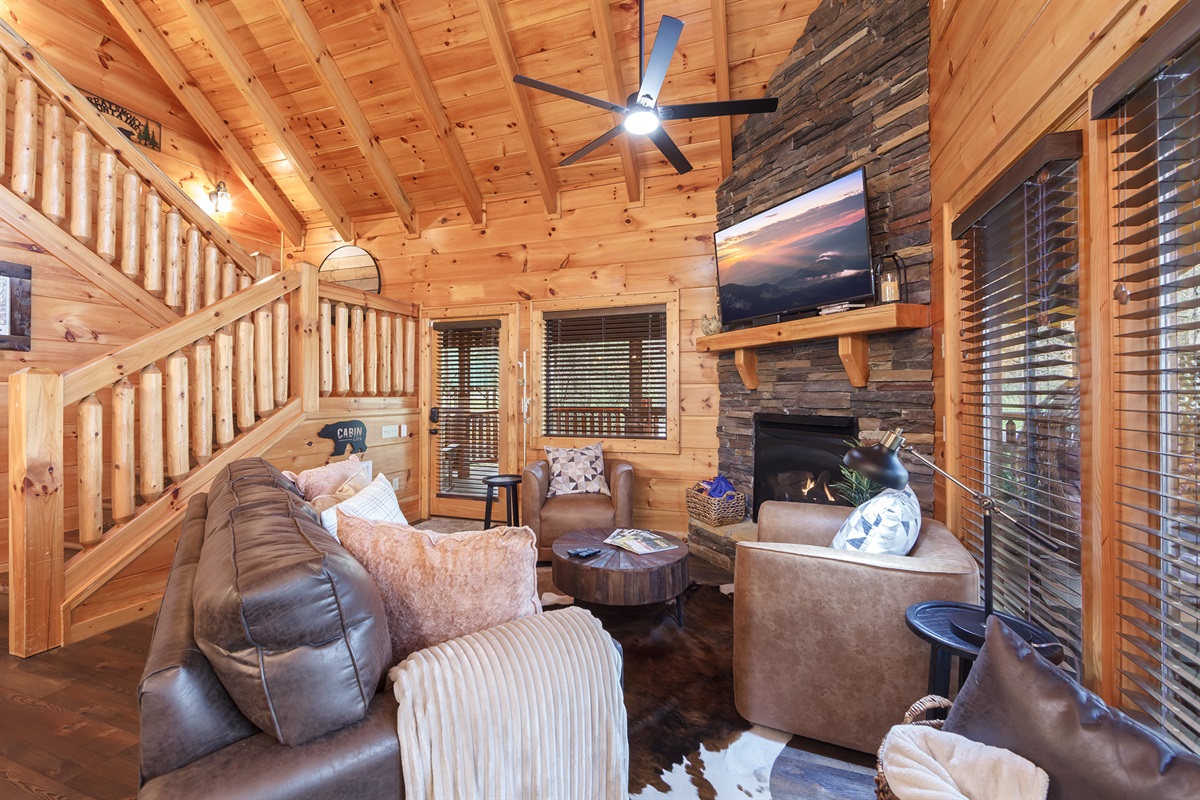🛋️ Living room with stone gas fireplace, large Smart TV and a sofa sleeper