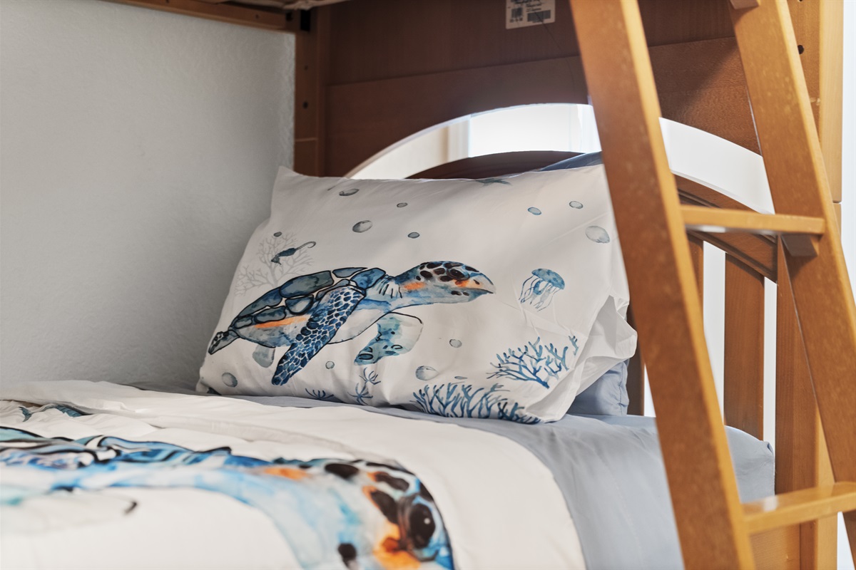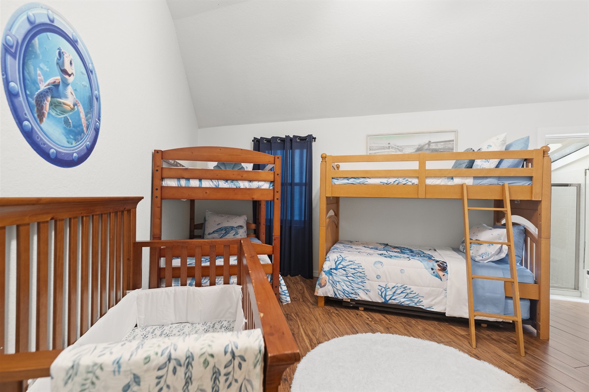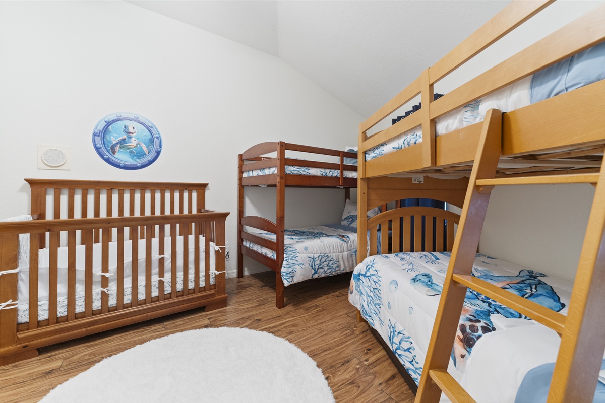 Guest bedroom with two twin-over-twin bunk beds (sleeps 4) + crib