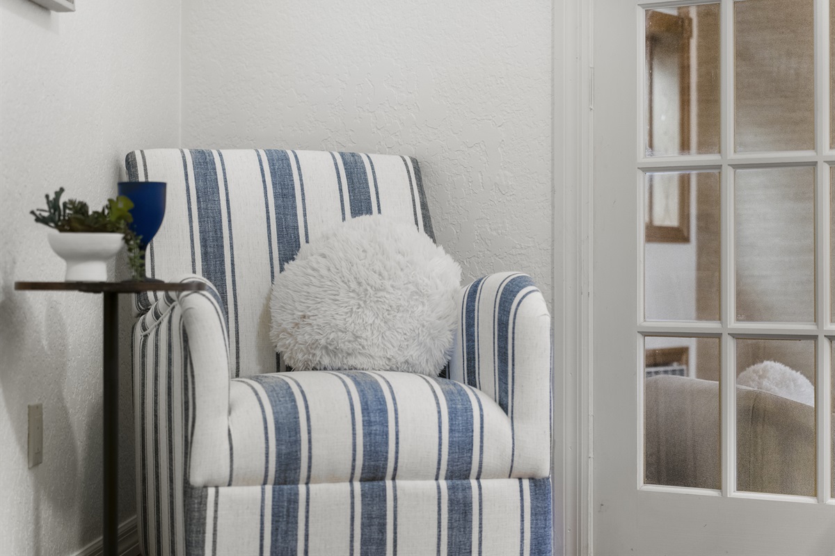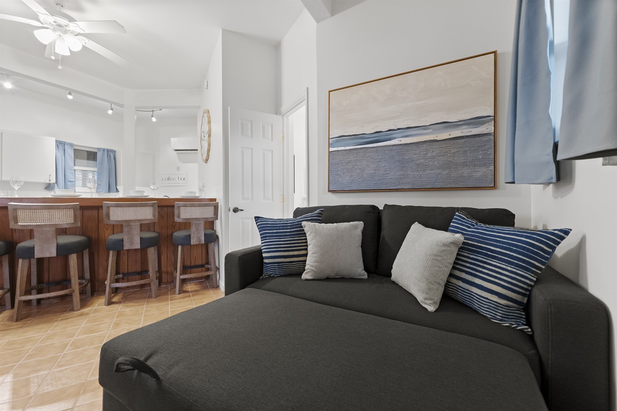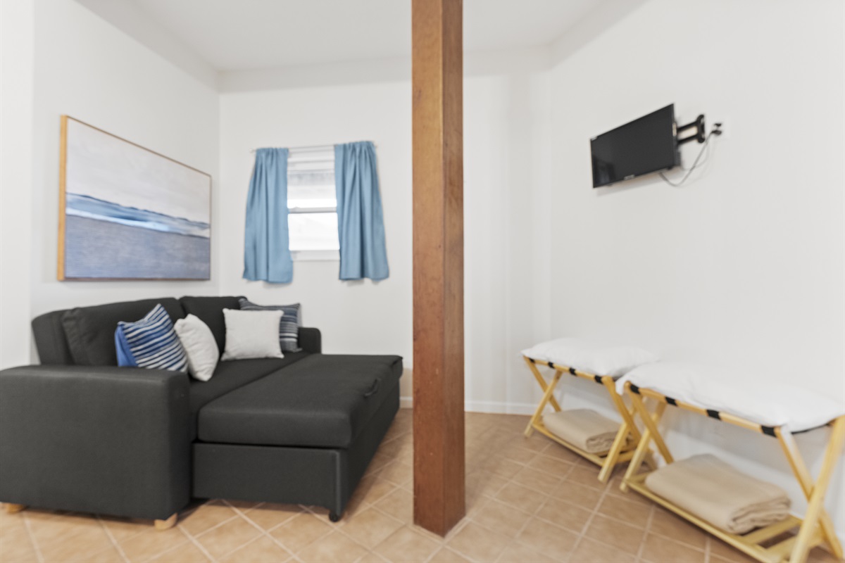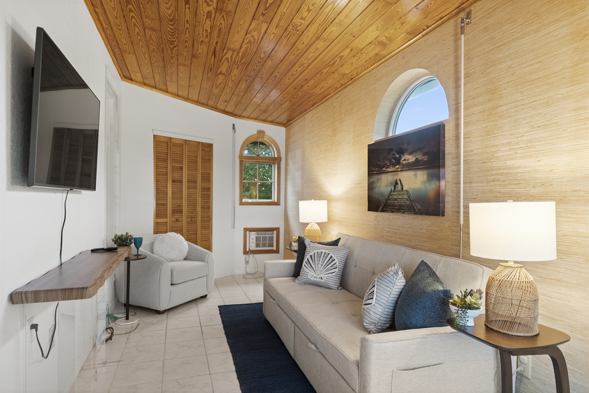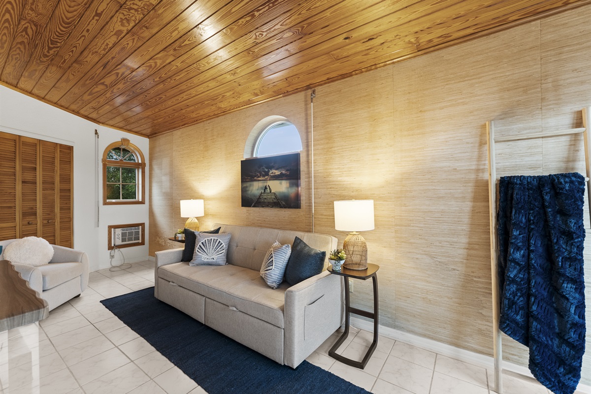 -Bonus step-down room off the primary with sleeper sofa, A/C wall unit & TV