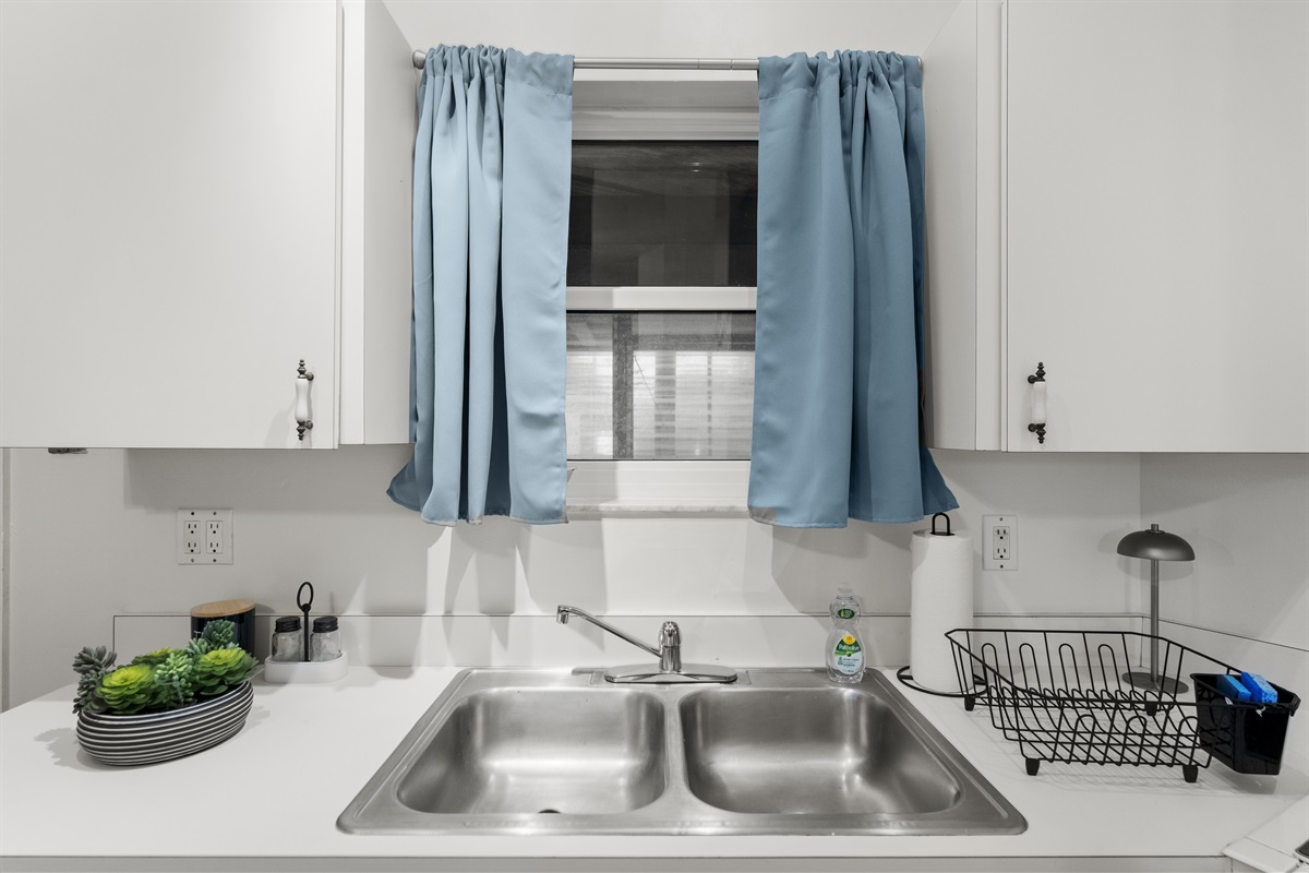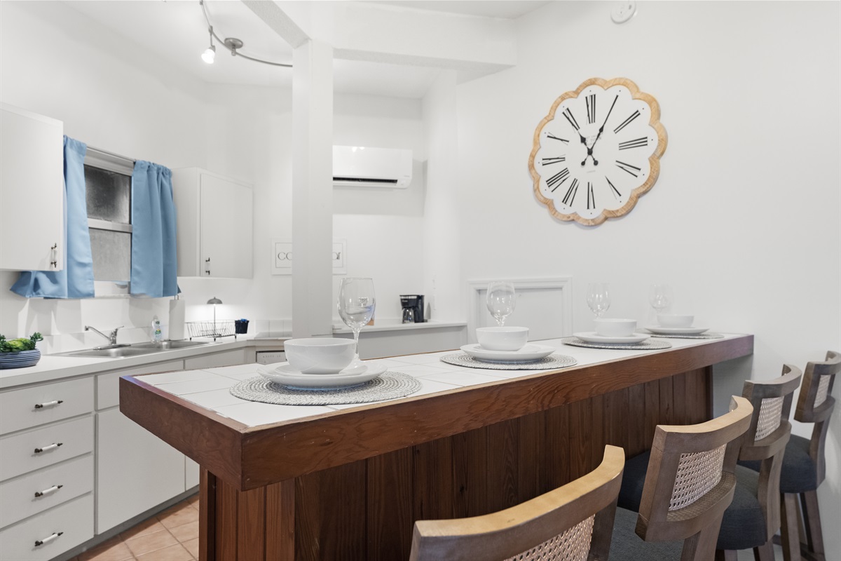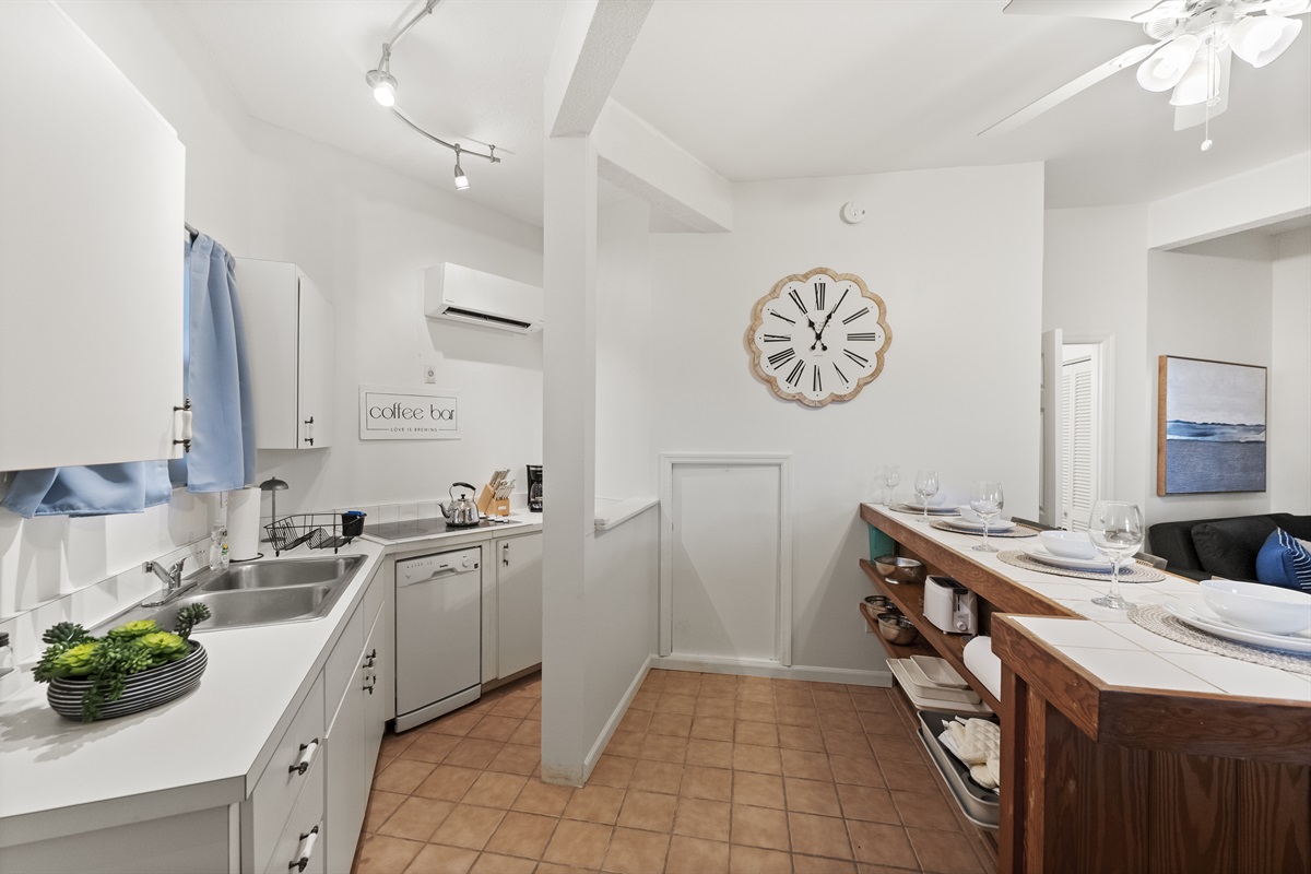 -Small but fully equipped kitchen: sink, stovetop, dishwasher, bar-top seating