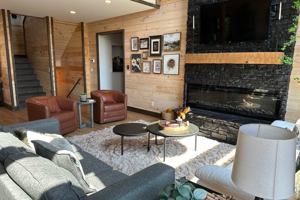 🛋️ Open concept living area with Smart TV and towering fireplace