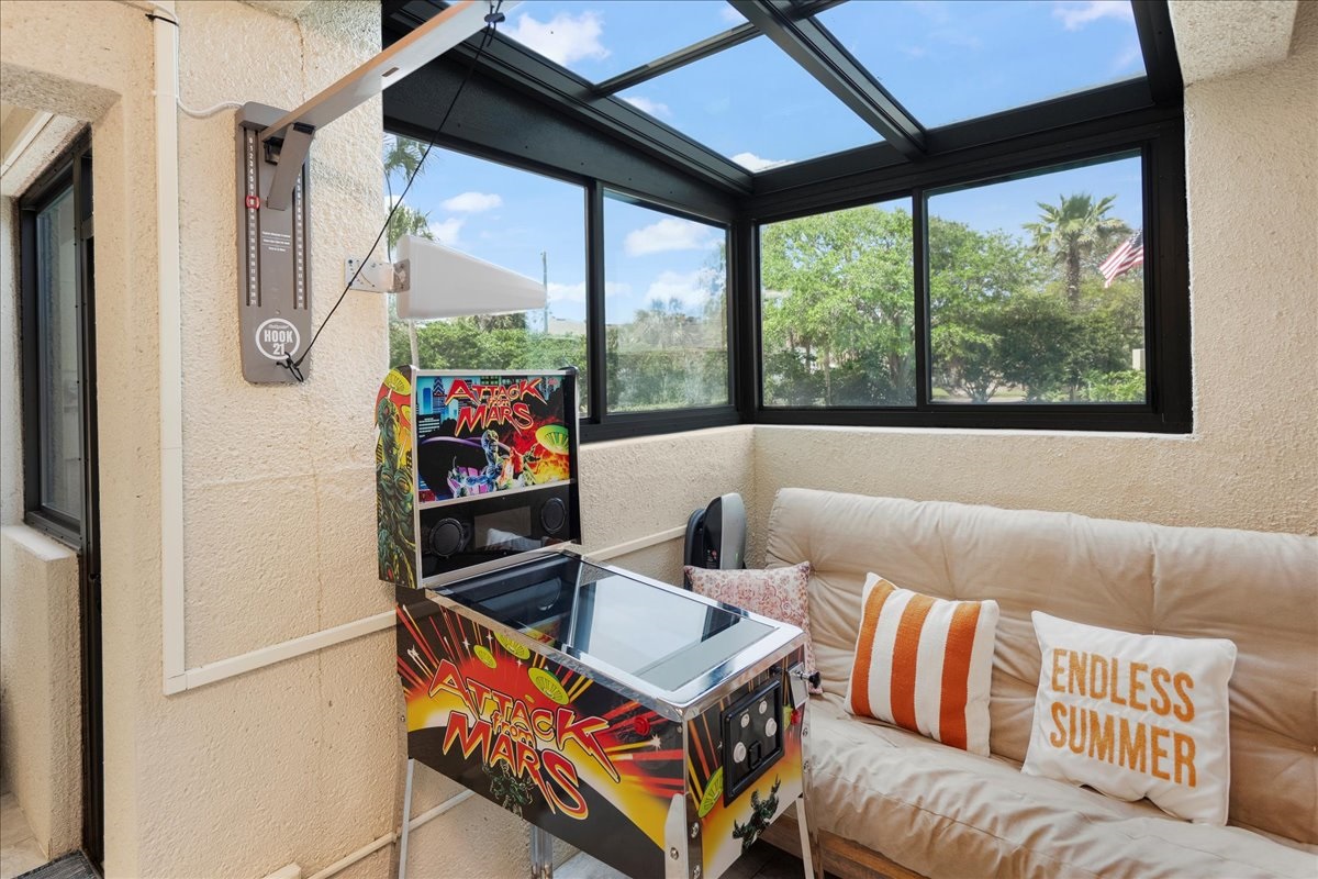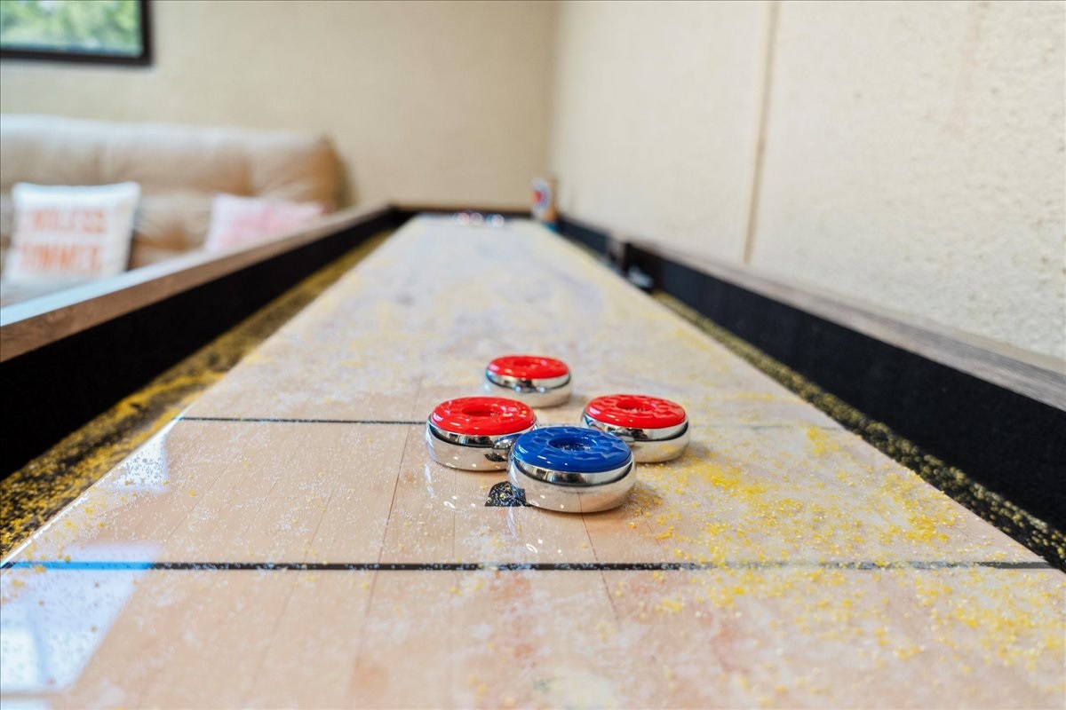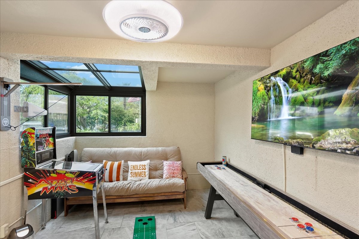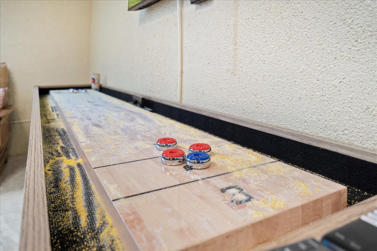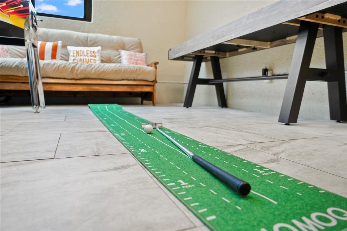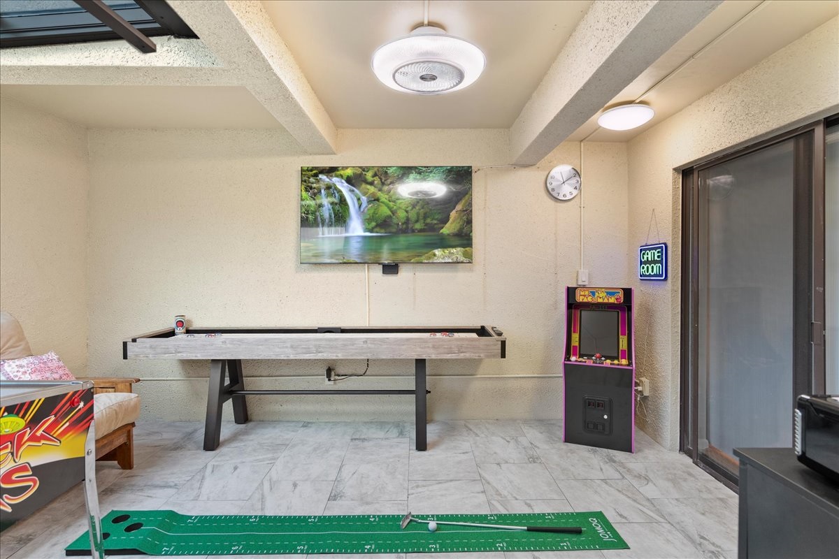 Shuffleboard, putting green, “Attack from Mars” arcade game, Hook 21, speakers, and 65” TV