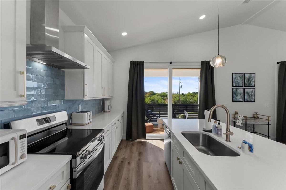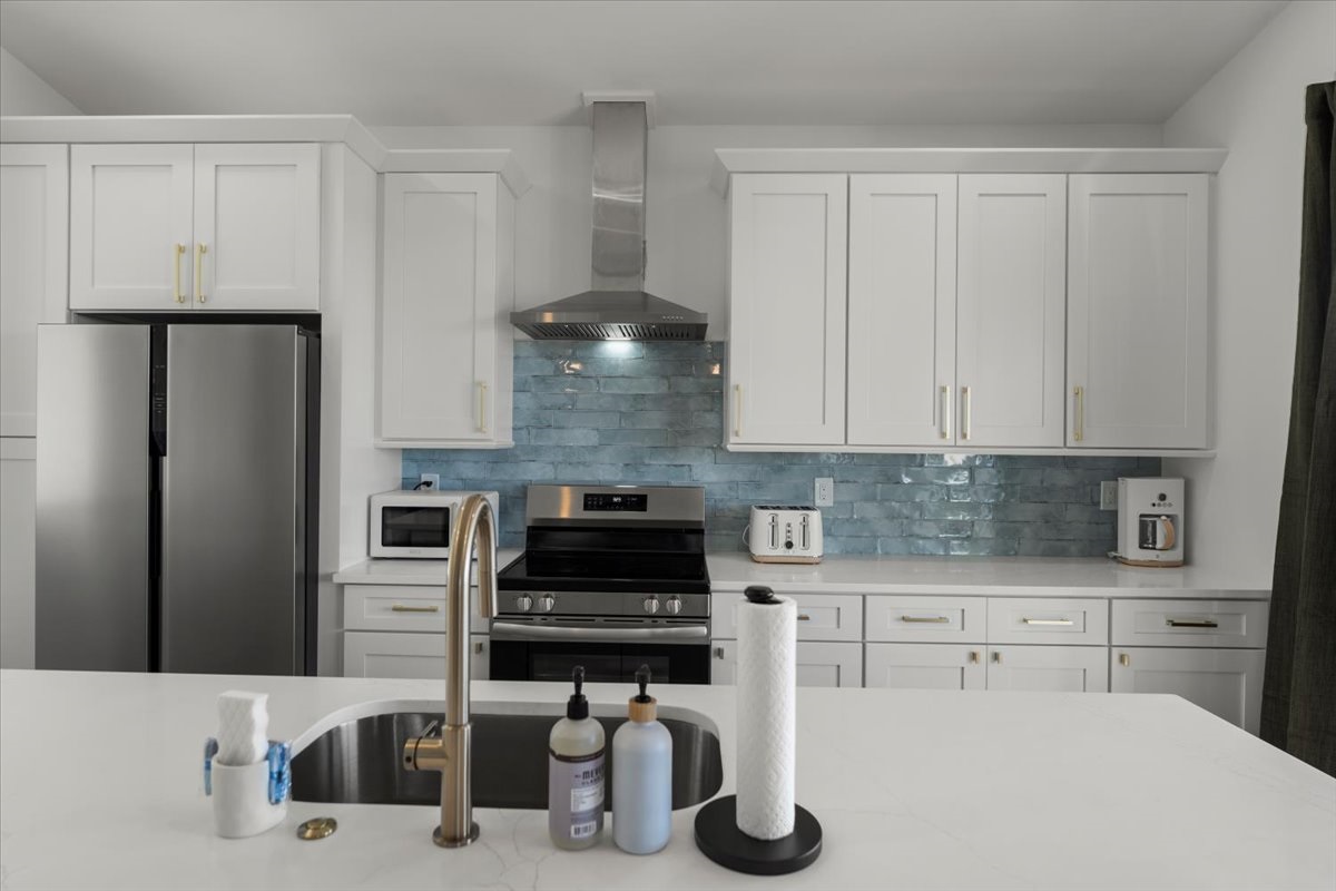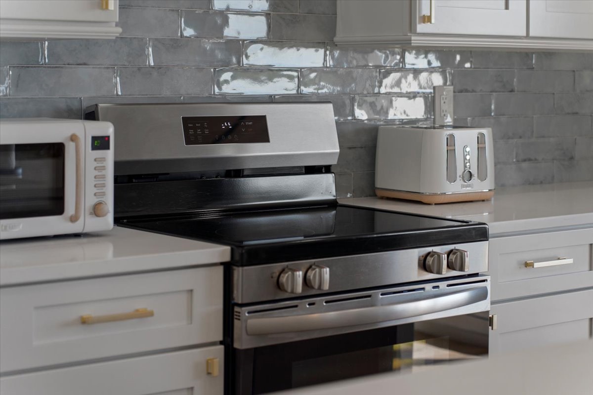 • Designer kitchen with quartz countertops + stainless appliances