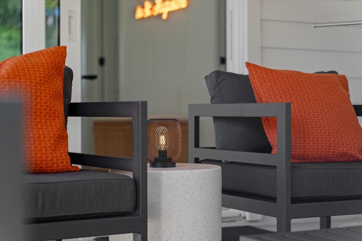 Private patio with lounge seating for sunrise coffee or sunset cocktails.