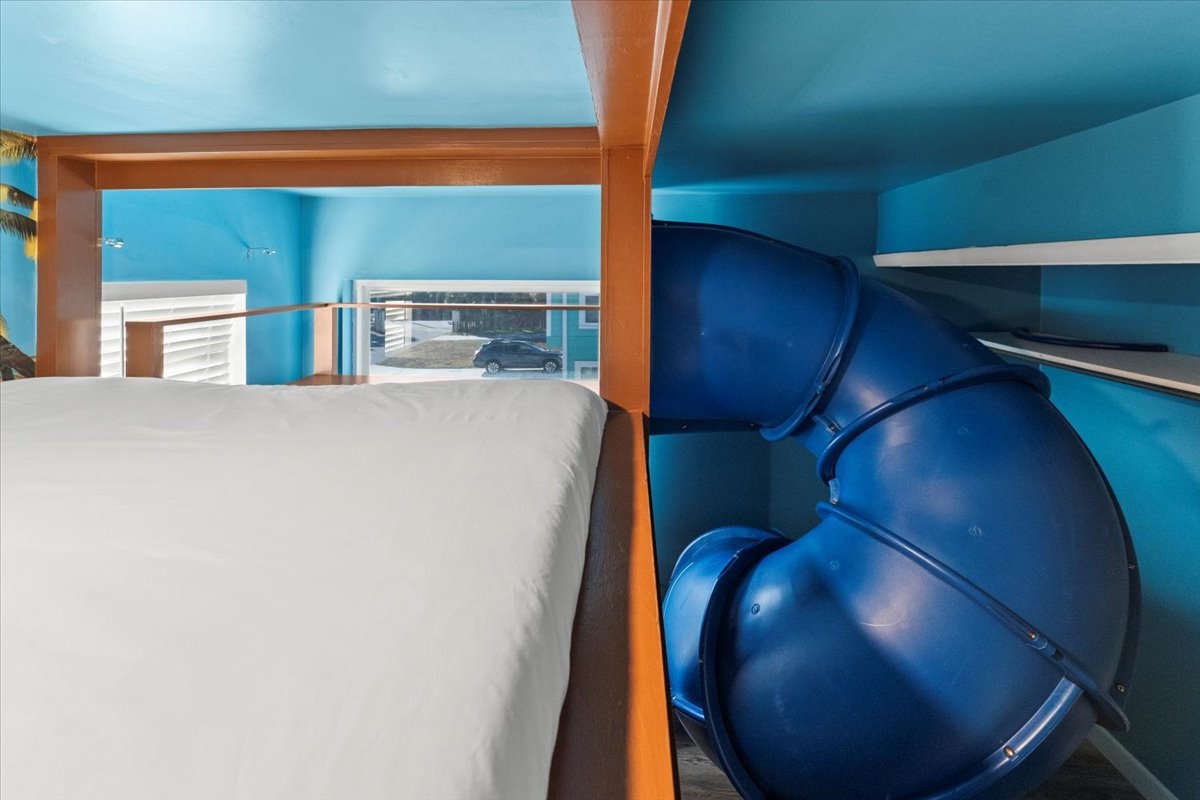 🛝 EPIC Kids’ Bunk Room – Built-in tube slide + playful coastal décor
