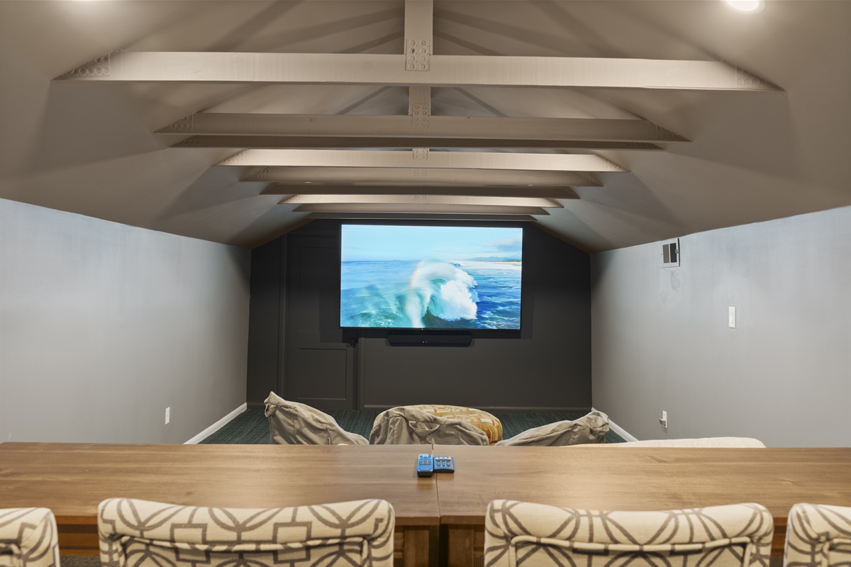 • Top-floor theater room: plush seating, cinema screen, popcorn machine